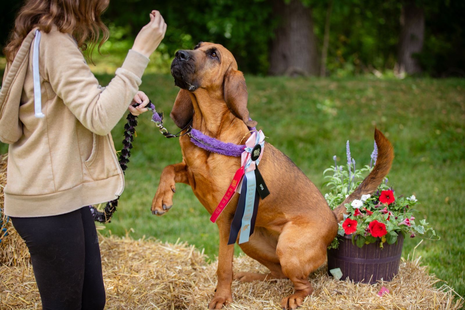 Going back to the very beginning, I attended my first workshop with my bloodhound Rosie in 2020 (who sadly passed away in March of this year), who definitely had her own opinions about rats. After a few years of dedication, she managed to get her novice and open titles with decent times. Even though the rat wasn’t in her best interest, every once in a while, my girl would pull through for me and gently tap them. However, Rosie plainly adored coming to trials and meeting new people or playing with old friends.